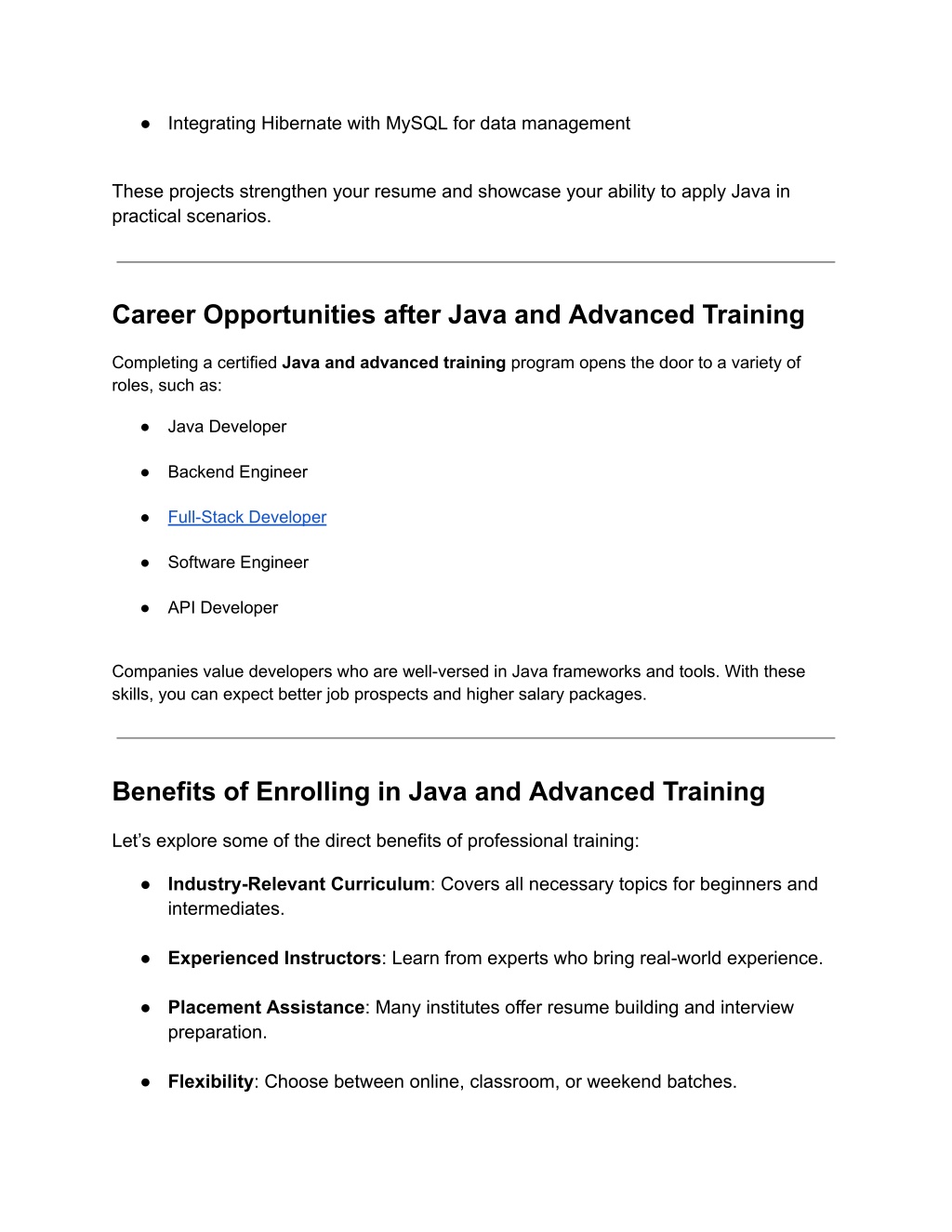 ● Integrating Hibernate with MySQL for data management These projects strengthen your resume and showcase your ability to apply Java in practical scenarios. Career Opportunities after Java and Advanced Training Completing a certified Java and advanced training program opens the door to a variety of roles, such as: ● Java Developer ● Backend Engineer ● Full-Stack Developer ● Software Engineer ● API Developer Companies value developers who are well-versed in Java frameworks and tools. With these skills, you can expect better job prospects and higher salary packages. Benefits of Enrolling in Java and Advanced Training Let’s explore some of the direct benefits of professional training: ● Industry-Relevant Curriculum: Covers all necessary topics for beginners and intermediates. ● Experienced Instructors: Learn from experts who bring real-world experience. ● Placement Assistance: Many institutes offer resume building and interview preparation. ● Flexibility: Choose between online, classroom, or weekend batches.