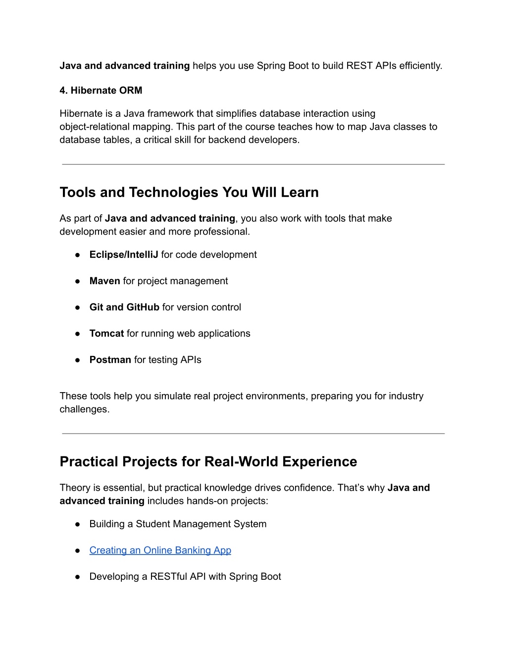 Java and advanced training helps you use Spring Boot to build REST APIs efficiently. 4. Hibernate ORM Hibernate is a Java framework that simplifies database interaction using object-relational mapping. This part of the course teaches how to map Java classes to database tables, a critical skill for backend developers. Tools and Technologies You Will Learn As part of Java and advanced training, you also work with tools that make development easier and more professional. ● Eclipse/IntelliJ for code development ● Maven for project management ● Git and GitHub for version control ● Tomcat for running web applications ● Postman for testing APIs These tools help you simulate real project environments, preparing you for industry challenges. Practical Projects for Real-World Experience Theory is essential, but practical knowledge drives confidence. That’s why Java and advanced training includes hands-on projects: ● Building a Student Management System ● Creating an Online Banking App ● Developing a RESTful API with Spring Boot