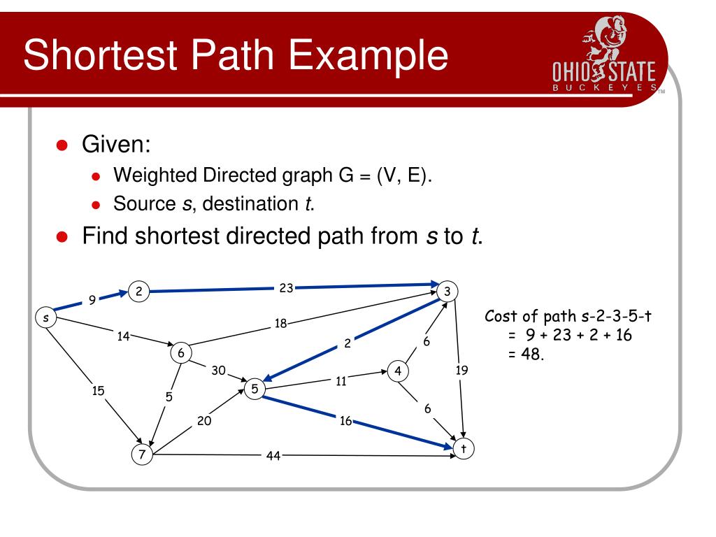 Example • We can find the shortest path by working back from the final vertex: • 9, 8, 5, 3, 2, 1 • Thus, the shortest path is (1, 2, 3, 5, 8, 9)