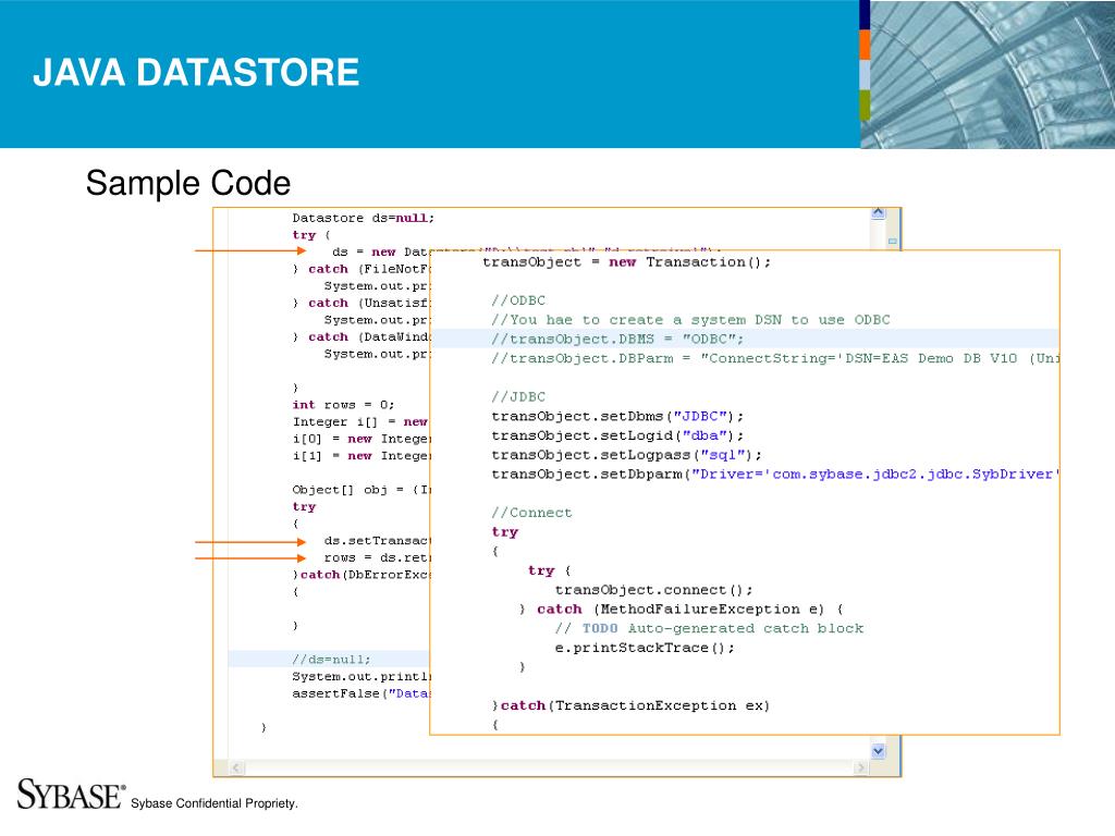 JAVA DATASTORE INTERFACE • Pure Java package. • Distributed as jdatastore.jar. • Non-visual Java Wrapper for DataWindow Server. • Can be used by the Java programmer for non-UI DataWindow functionality. • A JNI based interop layer to the DataWindow Server. • The DataWindow Server. Java Datastore JNI Interop Layer DataWindow Server + Database Interface Layer + XML Support + PDF Support Marshalling and Event Handling Management