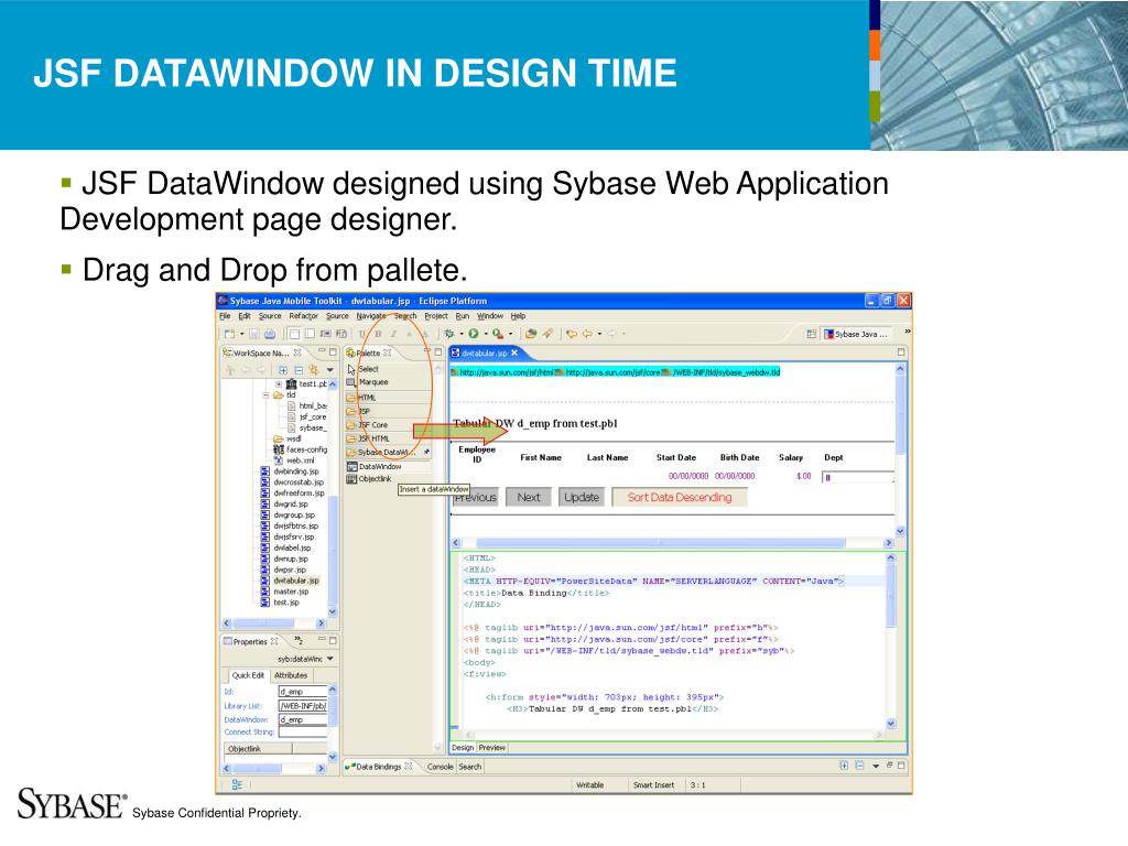 JSF DATAWINDOW IN DESIGN TIME • JSF DataWindow designed using Sybase Web Application Development page designer. • Drag and Drop from pallete.