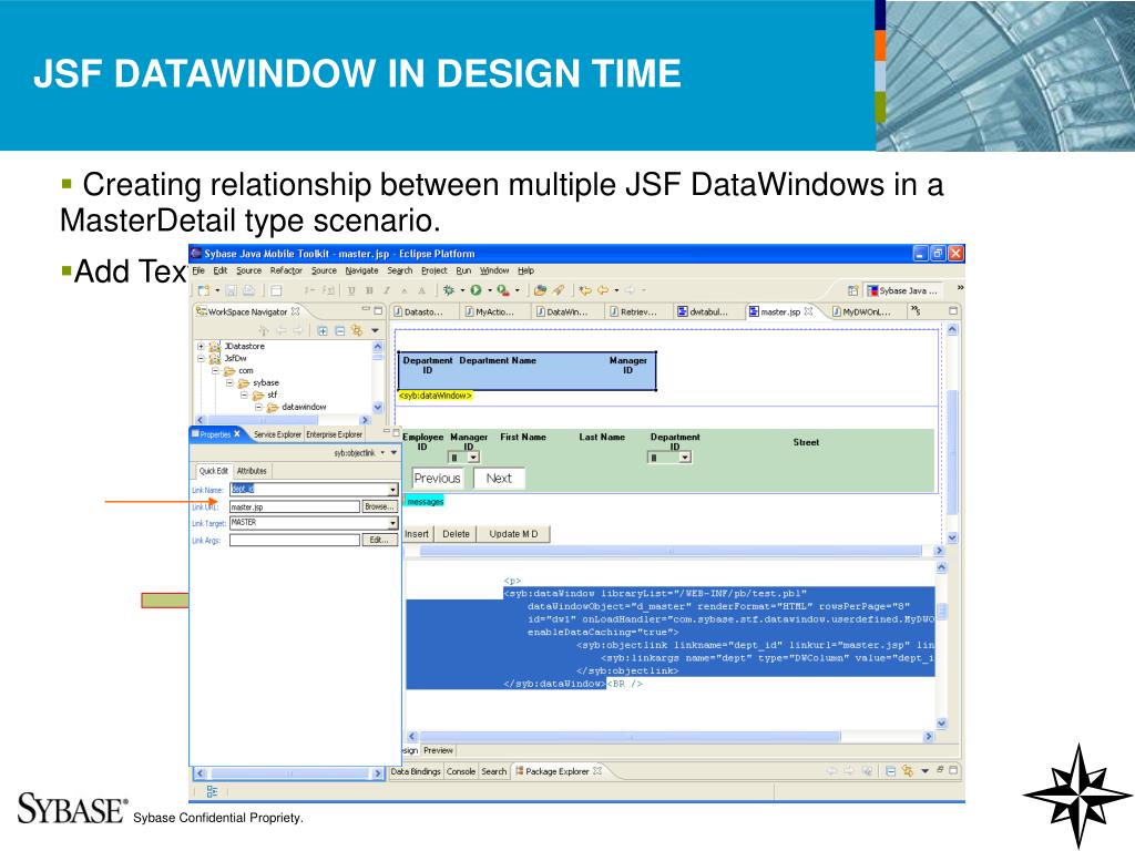 JSF DATAWINDOW IN DESIGN TIME • Creating relationship between multiple JSF DataWindows in a MasterDetail type scenario. • Add Text