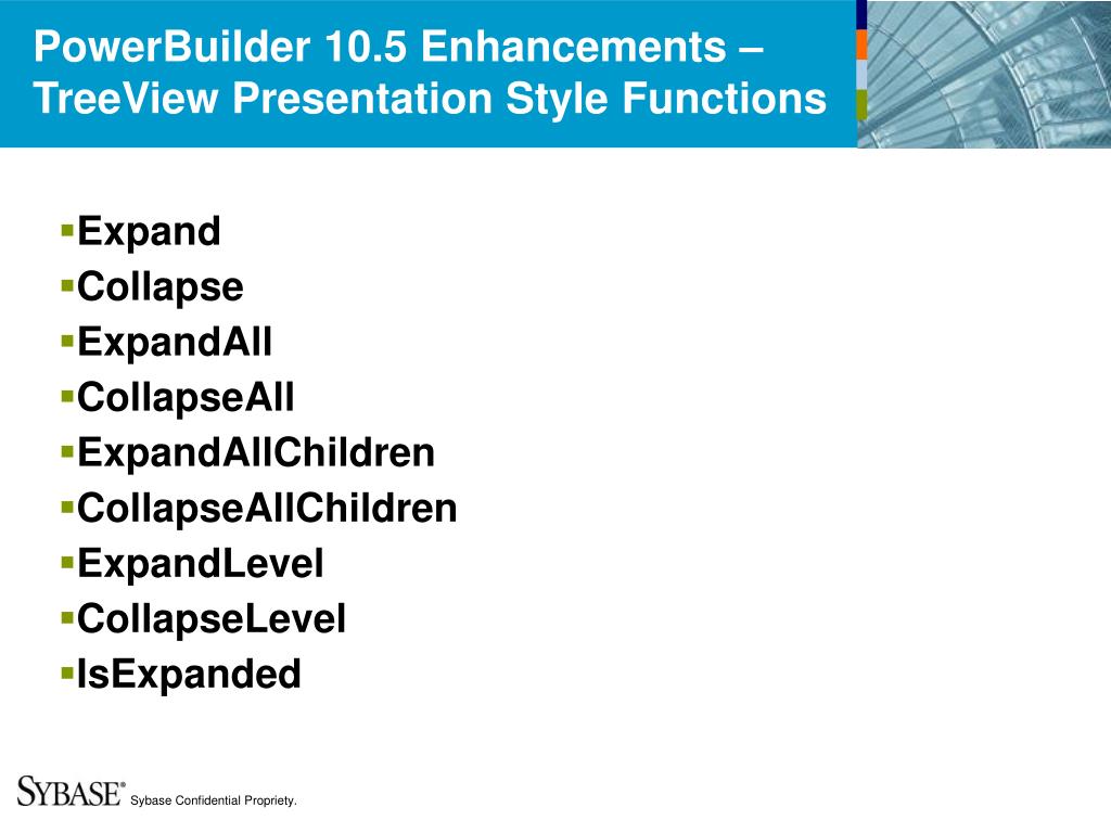 PowerBuilder 10.5 Enhancements – TreeView Presentation Style Functions • Expand • Collapse • ExpandAll • CollapseAll • ExpandAllChildren • CollapseAllChildren • ExpandLevel • CollapseLevel • IsExpanded