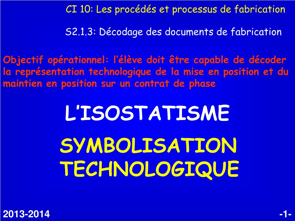 CI 10: Les procédés et processus de fabrication S2.1.3: Décodage des documents de fabrication Objectif opérationnel: l’élève doit être capable de décoder la représentation technologique de la mise en position et du maintien en position sur un contrat de phase L’ISOSTATISME SYMBOLISATION TECHNOLOGIQUE 2013-2014 -1-