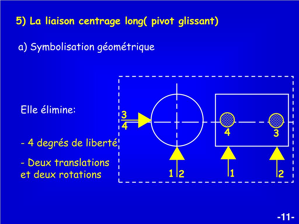 2 1 3 4 3 4 1 2 5) La liaison centrage long( pivot glissant) a) Symbolisation géométrique Elle élimine: - 4 degrés de liberté - Deux translations et deux rotations -11-