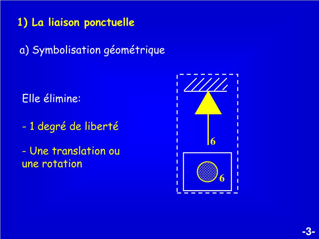 6 6 1) La liaison ponctuelle a) Symbolisation géométrique Elle élimine: - 1 degré de liberté - Une translation ou une rotation -3-