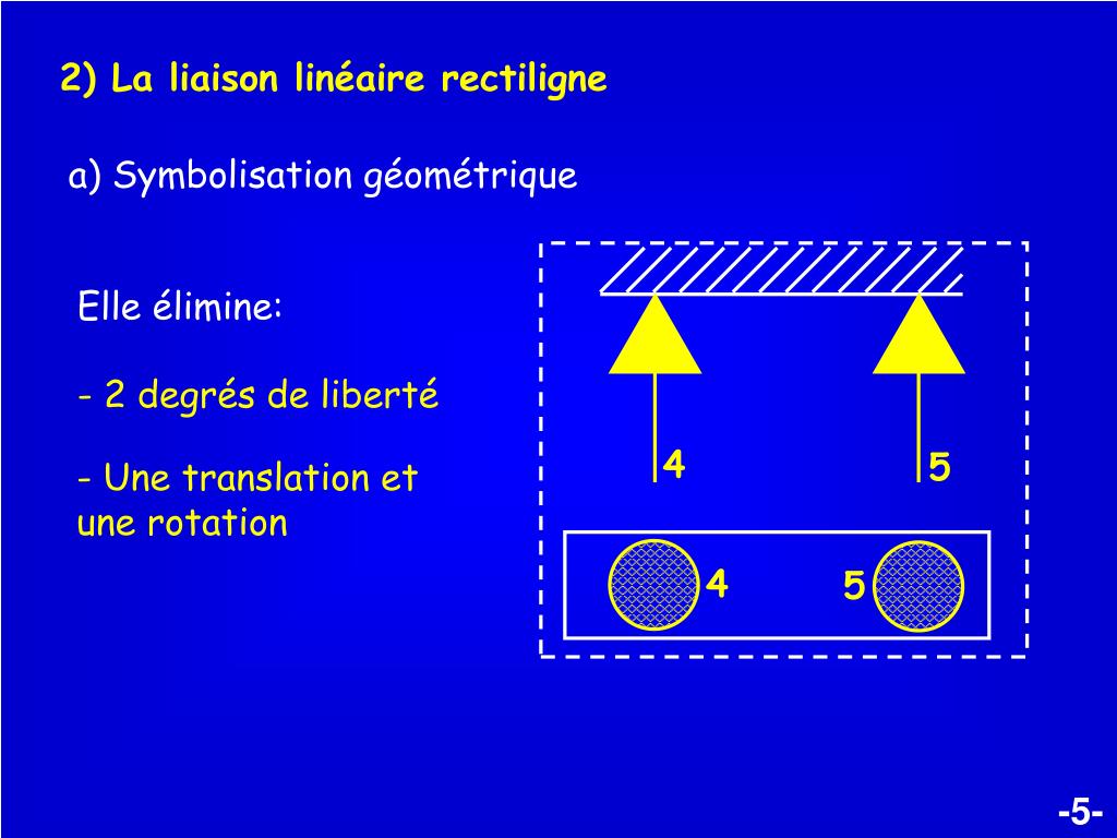 4 5 4 5 2) La liaison linéaire rectiligne a) Symbolisation géométrique Elle élimine: - 2 degrés de liberté - Une translation et une rotation -5-