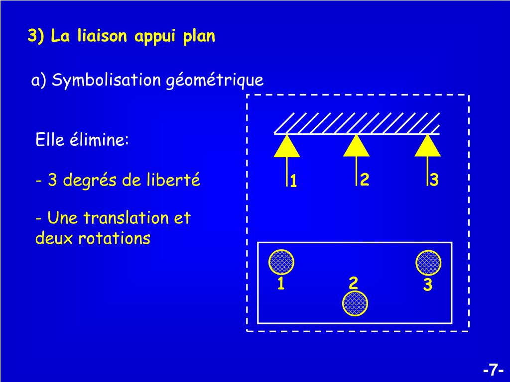2 3 1 2 1 3 3) La liaison appui plan a) Symbolisation géométrique Elle élimine: - 3 degrés de liberté - Une translation et deux rotations -7-