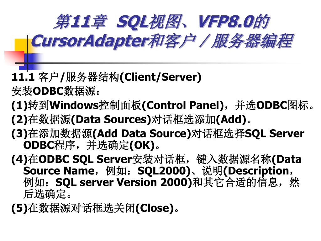 第 11 章 SQL 视图、 VFP8.0 的 CursorAdapter 和客户/服务器编程. 11.1 客户 / 服务器结构 (Client/Server) 安装 ODBC 数据源: (1) 转到 Windows 控制面板 (Control Panel) ,并选 ODBC 图标。 (2) 在数据源 (Data Sources) 对话框选添加 (Add) 。 (3) 在添加数据源 (Add Data Source) 对话框选择 SQL Server ODBC 程序,并选确定 (OK) 。