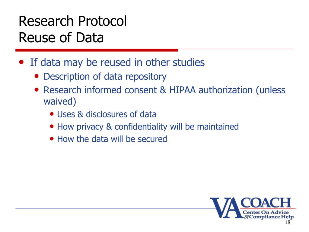 Research ProtocolReuse of Data • If data may be reused in other studies • Description of data repository • Research informed consent & HIPAA authorization (unless waived) • Uses & disclosures of data • How privacy & confidentiality will be maintained • How the data will be secured