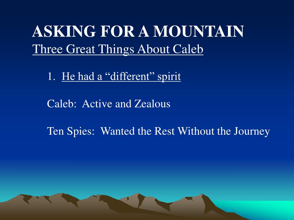 ASKING FOR A MOUNTAIN Three Great Things About Caleb • He had a “different” spirit • Num 14.24 • "But My servant Caleb, because he has a different spirit in him and has followed Me fully, I will bring into the land where he went, and his descendants shall inherit it.