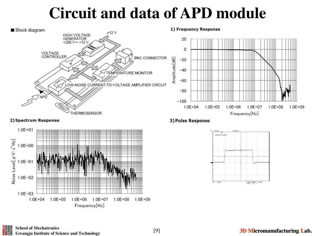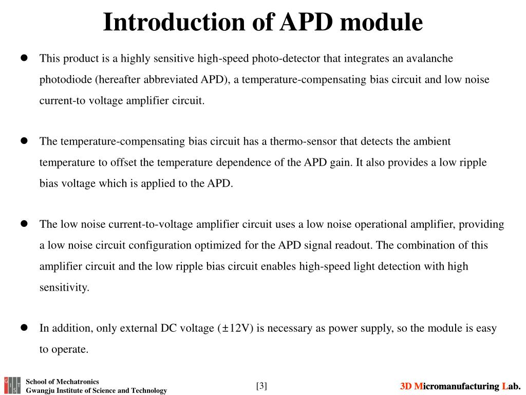 Introduction of APD module • This product is a highly sensitive high-speed photo-detector that integrates an avalanche photodiode (hereafter abbreviated APD), a temperature-compensating bias circuit and low noise current-to voltage amplifier circuit. • The temperature-compensating bias circuit has a thermo-sensor that detects the ambient temperature to offset the temperature dependence of the APD gain. It also provides a low ripple bias voltage which is applied to the APD. • The low noise current-to-voltage amplifier circuit uses a low noise operational amplifier, providing a low noise circuit configuration optimized for the APD signal readout. The combination of this amplifier circuit and the low ripple bias circuit enables high-speed light detection with high sensitivity. • In addition, only external DC voltage (±12V) is necessary as power supply, so the module is easy to operate.