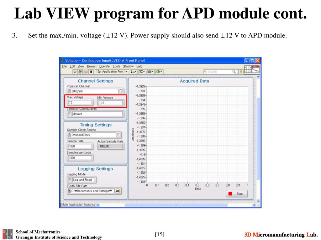 Lab VIEW program for APD module cont. Set the max./min. voltage (±12 V). Power supply should also send ±12 V to APD module.