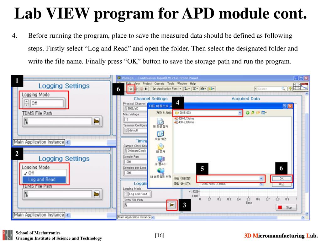 Lab VIEW program for APD module cont. Before running the program, place to save the measured data should be defined as following steps. Firstly select “Log and Read” and open the folder. Then select the designated folder and write the file name. Finally press “OK” button to save the storage path and run the program.