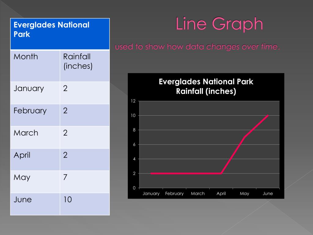 Graphs • A Graph is used to display data shown in a table. • It is easier to see data when it is displayed in a graph. • A BAR GRAPH is used to compare categories of data. • A LINE GRAPH is used to show how data changes over time.