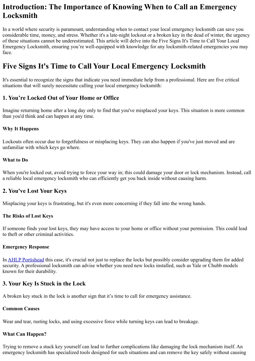Introduction: The Importance of Knowing When to Call an Emergency Locksmith In a world where security is paramount, understanding when to contact your local emergency locksmith can save you considerable time, money, and stress. Whether it's a late-night lockout or a broken key in the dead of winter, the urgency of these situations cannot be underestimated. This article will delve into the Five Signs It's Time to Call Your Local Emergency Locksmith, ensuring you’re well-equipped with knowledge for any locksmith-related emergencies you may face. Five Signs It's Time to Call Your Local Emergency Locksmith It's essential to recognize the signs that indicate you need immediate help from a professional. Here are five critical situations that will surely necessitate calling your local emergency locksmith: 1. You’re Locked Out of Your Home or Office Imagine returning home after a long day only to find that you've misplaced your keys. This situation is more common than you'd think and can happen at any time. Why It Happens Lockouts often occur due to forgetfulness or misplacing keys. They can also happen if you've just moved and are unfamiliar with which keys go where. What to Do When you're locked out, avoid trying to force your way in; this could damage your door or lock mechanism. Instead, call a reliable local emergency locksmith who can efficiently get you back inside without causing harm. 2. You've Lost Your Keys Misplacing your keys is frustrating, but it's even more concerning if they fall into the wrong hands. The Risks of Lost Keys If someone finds your lost keys, they may have access to your home or office without your permission. This could lead to theft or other criminal activities. Emergency Response In AHLP Portishead this case, it's crucial not just to replace the locks but possibly consider upgrading them for added security. A professional locksmith can advise whether you need new locks installed, such as Yale or Chubb models known for their durability. 3. Your Key Is Stuck in the Lock A broken key stuck in the lock is another sign that it’s time to call for emergency assistance. Common Causes Wear and tear, rusting locks, and using excessive force while turning keys can lead to breakage. What Can Happen? Trying to remove a stuck key yourself can lead to further complications like damaging the lock mechanism itself. An emergency locksmith has specialized tools designed for such situations and can remove the key safely without causing