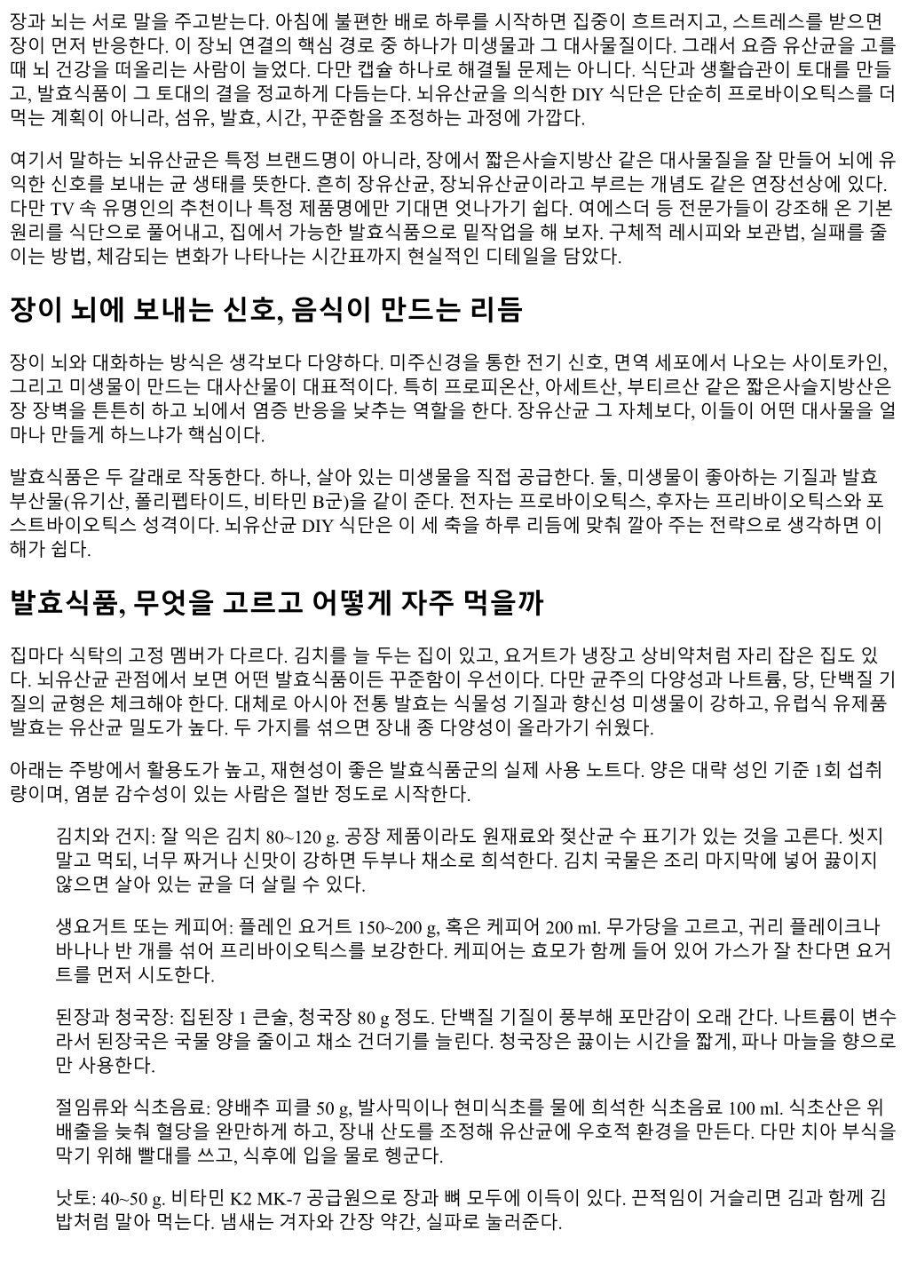 고, 점심에김치를 80 g 이상추가, 저녁라면을된장국과현미로대체했다. 첫주엔가스가늘었지만, 둘째주부 터배변시간이일정해지고오후졸림이줄었다. 넷째주에집에서만든양배추피클을추가하자속쓰림이사라 졌다. 여섯째주에는주말과식을해도회복이빨랐다. 캡슐형프로바이오틱스는넷째주부터하루 1캡슐로시작 해 4주만사용했다. 중간에멈췄지만후퇴는없었다. 이사례의핵심은완벽하게바꾸지않아도된다는점이다. 발효식품두세가지를축으로삼고, 곁가지들을차근 히붙여나가면장과뇌의리듬이맞춰진다. 흔한질문, 현장에서자주답한것들 Q. 발효식품을끓이면뇌유산균의미가사라지나요? A. 살아있는균은줄지만, 유기산과펩타이드같은포스트바이오틱스는남는다. 장벽과면역에는여전히도움 을준다. 뇌유산균관점에서도온전한가치가있으니, 국과찌개를포기할필요는없다. 다만생으로곁들이는한 접시를하루한번유지하면균형이좋아진다. Q. 저염식과발효식품은양립가능한가요? A. 가능하다. 발효의맛을살리면서도나트륨을줄이는요령은농도를낮추는대신양념의향을끌어올리는것. 파, 마늘, 생강, 식초, 통후추를적절히쓰고, 국물보다는건더기위주로먹는다. 김치에서국물은쯔유처럼간을 더할때만한두숟갈사용한다. Q. 장뇌유산균표시가있는제품은더좋은가요? A. 마케팅용어일가능성이높다. 뇌와관련된연구가있는균주를담았다는의미라면가치가있지만, 개인의장 내생태와식단에따라반응은크게달라진다. 라벨의균주, CFU, 보관법을먼저보고, 한번에한제품씩 4주테 스트하는방식을권한다. Q. 술과함께먹어도되나요? A. 알코올은장벽을느슨하게만들고, 숙면을방해한다. 어쩔수없는자리라면술의양을줄이고, 발효식품은다 음날아침부터회복모드로넣는다. 식초음료와케피어가회복에도움이된다. 숙취전용음료보다수분과전해 질, 가벼운탄수와단백질이낫다. 체크리스트, 2주에한번점검 하루섬유 25~30 g을꾸준히채우고있는가발효식품두가지이상을매일, 서로다른시간대에먹고있는 가소금과당을미세조정하고있는가, 가공식품이다시늘지않았는가수면시간이규칙적인가, 취침 1시 간전스크린을끄고있는가변비, 설사, 가스가 2주이상지속되면변수하나씩조정하고있는가 체크리스트가모두체크되면, 집중력과기분점수가올라가지않을이유가없다. 놓친항목이있다면완벽주의 대신중요도순으로하나씩만고친다. 보통은수면과섬유에서가장큰변화를얻는다. 마무리, 식탁에서시작해뇌까지닿는작은누적 뇌유산균을위한 DIY 식단은화려하지않다. 슈퍼푸드몇가지를들이붓는방식이아니라, 장이좋아하는환경 을매일묵묵히깔아주는일이다. 발효식품은그환경을단단히받쳐준다. 김치한접시, 케피어한잔, 된장한 숟갈, 낫토반팩. 이작은조각들이장내균형을바꾸고, 그균형이신호가되어하루의집중과기분을다독인다. 제품을고를때도상표가아닌라벨을, 일상을바꿀때도한번에가아니라조금씩을고른다. 몇주만지켜보면 식탁에서시작한변화가머릿속까지닿는다는것을, 몸이먼저알려준다.