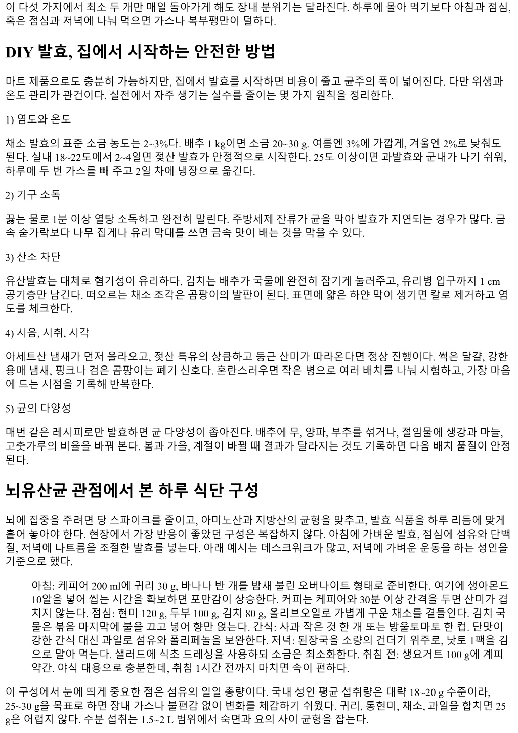 이다섯가지에서최소두개만매일돌아가게해도장내분위기는달라진다. 하루에몰아먹기보다아침과점심, 혹은점심과저녁에나눠먹으면가스나복부팽만이덜하다. DIY 발효, 집에서시작하는안전한방법 마트제품으로도충분히가능하지만, 집에서발효를시작하면비용이줄고균주의폭이넓어진다. 다만위생과 온도관리가관건이다. 실전에서자주생기는실수를줄이는몇가지원칙을정리한다. 1) 염도와온도 채소발효의표준소금농도는 2~3%다. 배추 1 kg이면소금 20~30 g. 여름엔 3%에가깝게, 겨울엔 2%로낮춰도 된다. 실내 18~22도에서 2~4일면젖산발효가안정적으로시작한다. 25도이상이면과발효와군내가나기쉬워, 하루에두번가스를빼주고 2일차에냉장으로옮긴다. 2) 기구소독 끓는물로 1분이상열탕소독하고완전히말린다. 주방세제잔류가균을막아발효가지연되는경우가많다. 금 속숟가락보다나무집게나유리막대를쓰면금속맛이배는것을막을수있다. 3) 산소차단 유산발효는대체로혐기성이유리하다. 김치는배추가국물에완전히잠기게눌러주고, 유리병입구까지 1 cm 공기층만남긴다. 떠오르는채소조각은곰팡이의발판이된다. 표면에얇은하얀막이생기면칼로제거하고염 도를체크한다. 4) 시음, 시취, 시각 아세트산냄새가먼저올라오고, 젖산특유의상큼하고둥근산미가따라온다면정상진행이다. 썩은달걀, 강한 용매냄새, 핑크나검은곰팡이는폐기신호다. 혼란스러우면작은병으로여러배치를나눠시험하고, 가장마음 에드는시점을기록해반복한다. 5) 균의다양성 매번같은레시피로만발효하면균다양성이좁아진다. 배추에무, 양파, 부추를섞거나, 절임물에생강과마늘, 고춧가루의비율을바꿔본다. 봄과가을, 계절이바뀔때결과가달라지는것도기록하면다음배치품질이안정 된다. 뇌유산균관점에서본하루식단구성 뇌에집중을주려면당스파이크를줄이고, 아미노산과지방산의균형을맞추고, 발효식품을하루리듬에맞게 흩어놓아야한다. 현장에서가장반응이좋았던구성은복잡하지않다. 아침에가벼운발효, 점심에섬유와단백 질, 저녁에나트륨을조절한발효를넣는다. 아래예시는데스크워크가많고, 저녁에가벼운운동을하는성인을 기준으로했다. 아침: 케피어 200 ml에귀리 30 g, 바나나반개를밤새불린오버나이트형태로준비한다. 여기에생아몬드 10알을넣어씹는시간을확보하면포만감이상승한다. 커피는케피어와 30분이상간격을두면산미가겹 치지않는다. 점심: 현미 120 g, 두부 100 g, 김치 80 g, 올리브오일로가볍게구운채소를곁들인다. 김치국 물은볶음마지막에불을끄고넣어향만얹는다. 간식: 사과작은것한개또는방울토마토한컵. 단맛이 강한간식대신과일로섬유와폴리페놀을보완한다. 저녁: 된장국을소량의건더기위주로, 낫토 1팩을김 으로말아먹는다. 샐러드에식초드레싱을사용하되소금은최소화한다. 취침전: 생요거트 100 g에계피 약간. 야식대용으로충분한데, 취침 1시간전까지마치면속이편하다. 이구성에서눈에띄게중요한점은섬유의일일총량이다. 국내성인평균섭취량은대략 18~20 g 수준이라, 25~30 g을목표로하면장내가스나불편감없이변화를체감하기쉬웠다. 귀리, 통현미, 채소, 과일을합치면 25 g은어렵지않다. 수분섭취는 1.5~2 L 범위에서숙면과요의사이균형을잡는다.