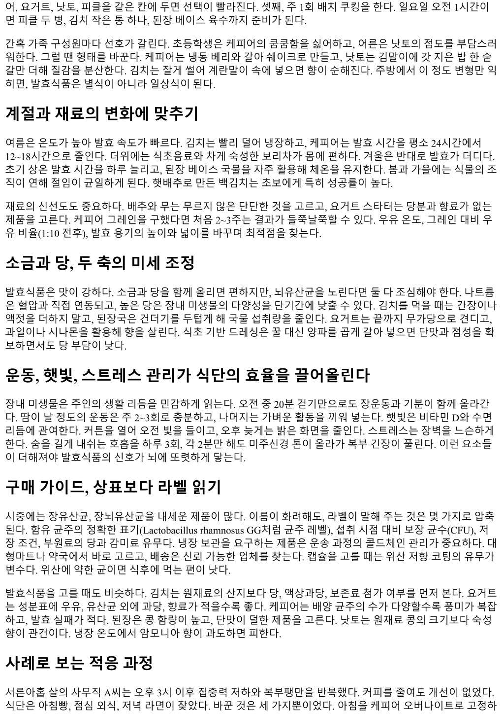 어, 요거트, 낫토, 피클을같은칸에두면선택이빨라진다. 셋째, 주 1회배치쿠킹을한다. 일요일오전 1시간이 면피클두병, 김치작은통하나, 된장베이스육수까지준비가된다. 간혹가족구성원마다선호가갈린다. 초등학생은케피어의쿰쿰함을싫어하고, 어른은낫토의점도를부담스러 워한다. 그럴땐형태를바꾼다. 케피어는냉동베리와갈아쉐이크로만들고, 낫토는김말이에갓지은밥한숟 갈만더해질감을분산한다. 김치는잘게썰어계란말이속에넣으면향이순해진다. 주방에서이정도변형만익 히면, 발효식품은별식이아니라일상식이된다. 계절과재료의변화에맞추기 여름은온도가높아발효속도가빠르다. 김치는빨리덜어냉장하고, 케피어는발효시간을평소 24시간에서 12~18시간으로줄인다. 더위에는식초음료와차게숙성한보리차가몸에편하다. 겨울은반대로발효가더디다. 초기상온발효시간을하루늘리고, 된장베이스국물을자주활용해체온을유지한다. 봄과가을에는식물의조 직이연해절임이균일하게된다. 햇배추로만든백김치는초보에게특히성공률이높다. 재료의신선도도중요하다. 배추와무는무르지않은단단한것을고르고, 요거트스타터는당분과향료가없는 제품을고른다. 케피어그레인을구했다면처음 2~3주는결과가들쭉날쭉할수있다. 우유온도, 그레인대비우 유비율(1:10 전후), 발효용기의높이와넓이를바꾸며최적점을찾는다. 소금과당, 두축의미세조정 발효식품은맛이강하다. 소금과당을함께올리면편하지만, 뇌유산균을노린다면둘다조심해야한다. 나트륨 은혈압과직접연동되고, 높은당은장내미생물의다양성을단기간에낮출수있다. 김치를먹을때는간장이나 액젓을더하지말고, 된장국은건더기를두텁게해국물섭취량을줄인다. 요거트는끝까지무가당으로견디고, 과일이나시나몬을활용해향을살린다. 식초기반드레싱은꿀대신양파를곱게갈아넣으면단맛과점성을확 보하면서도당부담이낮다. 운동, 햇빛, 스트레스관리가식단의효율을끌어올린다 장내미생물은주인의생활리듬을민감하게읽는다. 오전중 20분걷기만으로도장운동과기분이함께올라간 다. 땀이날정도의운동은주 2~3회로충분하고, 나머지는가벼운활동을끼워넣는다. 햇빛은비타민 D와수면 리듬에관여한다. 커튼을열어오전빛을들이고, 오후늦게는밝은화면을줄인다. 스트레스는장벽을느슨하게 한다. 숨을길게내쉬는호흡을하루 3회, 각 2분만해도미주신경톤이올라가복부긴장이풀린다. 이런요소들 이더해져야발효식품의신호가뇌에또렷하게닿는다. 구매가이드, 상표보다라벨읽기 시중에는장유산균, 장뇌유산균을내세운제품이많다. 이름이화려해도, 라벨이말해주는것은몇가지로압축 된다. 함유균주의정확한표기(Lactobacillus rhamnosus GG처럼균주레벨), 섭취시점대비보장균수(CFU), 저 장조건, 부원료의당과감미료유무다. 냉장보관을요구하는제품은운송과정의콜드체인관리가중요하다. 대 형마트나약국에서바로고르고, 배송은신뢰가능한업체를찾는다. 캡슐을고를때는위산저항코팅의유무가 변수다. 위산에약한균이면식후에먹는편이낫다. 발효식품을고를때도비슷하다. 김치는원재료의산지보다당, 액상과당, 보존료첨가여부를먼저본다. 요거트 는성분표에우유, 유산균외에과당, 향료가적을수록좋다. 케피어는배양균주의수가다양할수록풍미가복잡 하고, 발효실패가적다. 된장은콩함량이높고, 단맛이덜한제품을고른다. 낫토는원재료콩의크기보다숙성 향이관건이다. 냉장온도에서암모니아향이과도하면피한다. 사례로보는적응과정 서른아홉살의사무직 A씨는오후 3시이후집중력저하와복부팽만을반복했다. 커피를줄여도개선이없었다. 식단은아침빵, 점심외식, 저녁라면이잦았다. 바꾼것은세가지뿐이었다. 아침을케피어오버나이트로고정하