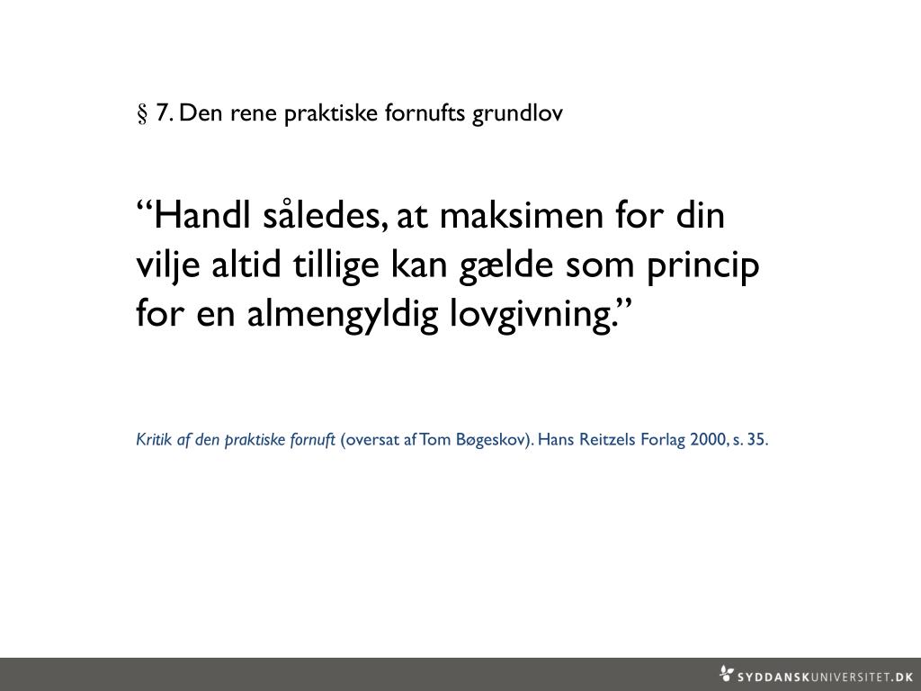 § 7. Den renepraktiskefornuftsgrundlov • “Handl således, at maksimen for din vilje altid tillige kan gælde som princip for en almengyldig lovgivning.” • Kritik af den praktiske fornuft (oversat af Tom Bøgeskov). Hans Reitzels Forlag 2000, s. 35.