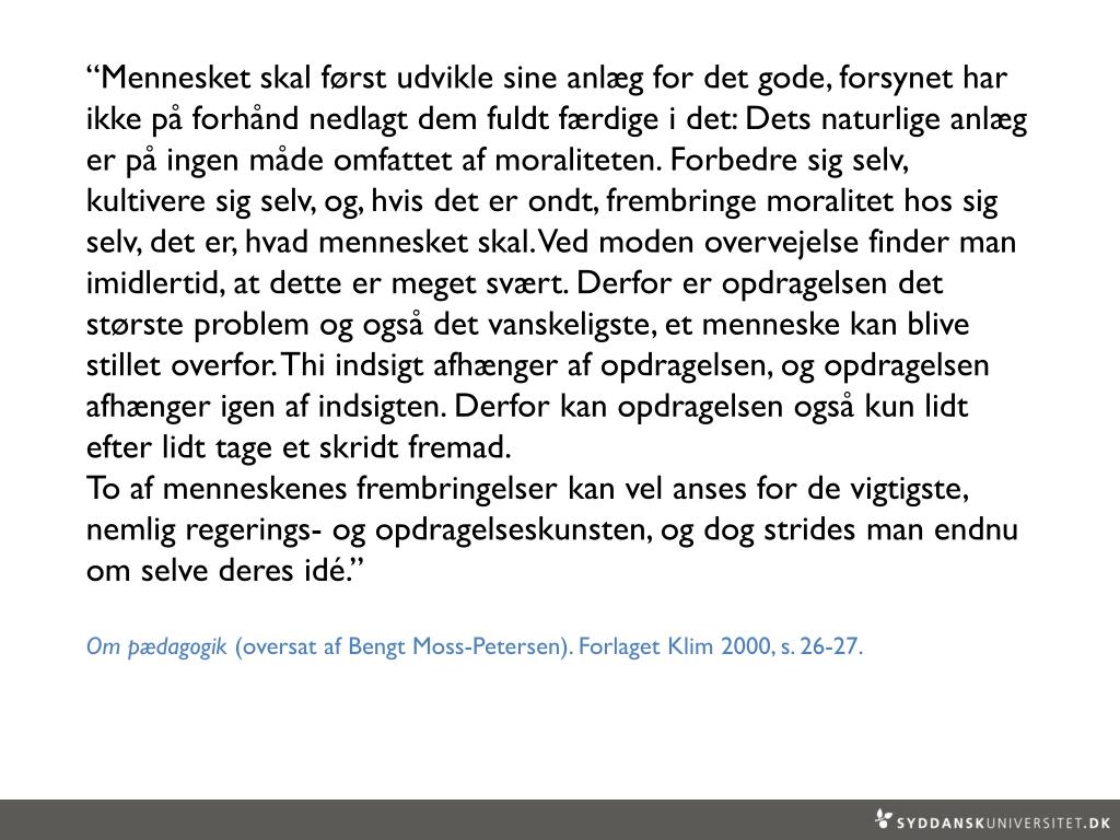 “Mennesket kan kun blive til menneske gennem opdragelse. Det er intet andet end det, som opdragelsen gør det til. Det skal bemærkes, at mennesker kun bliver opdraget af mennesker, der ligeledes er opdraget. Derfor gør mangel på disciplin og undervisning også nogle mennesker til dårlige opdragere af deres elever. … Da opdragelsen imidlertid dels lærer mennesket noget, dels blot udvikler noget hos det, så kan man ikke vide, hvor langt dets naturlige anlæg rækker.” Om pædagogik(oversataf Bengt Moss-Petersen). ForlagetKlim 2000, s. 23-24.