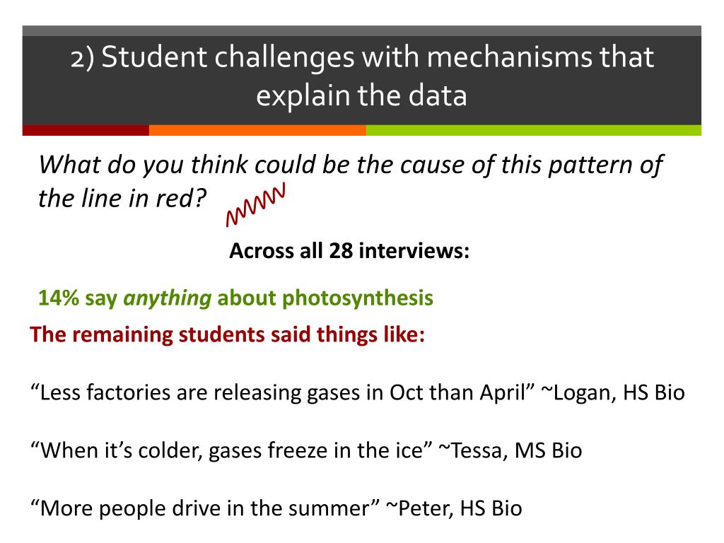 2) Student challenges with mechanisms that explain the data What do you think could be the cause of this pattern of the line in red? 14% say anything about photosynthesis Across all 28 interviews: The remaining students said things like: “Less factories are releasing gases in Oct than April” ~Logan, HS Bio“When it’s colder, gases freeze in the ice” ~Tessa, MS Bio“More people drive in the summer” ~Peter, HS Bio