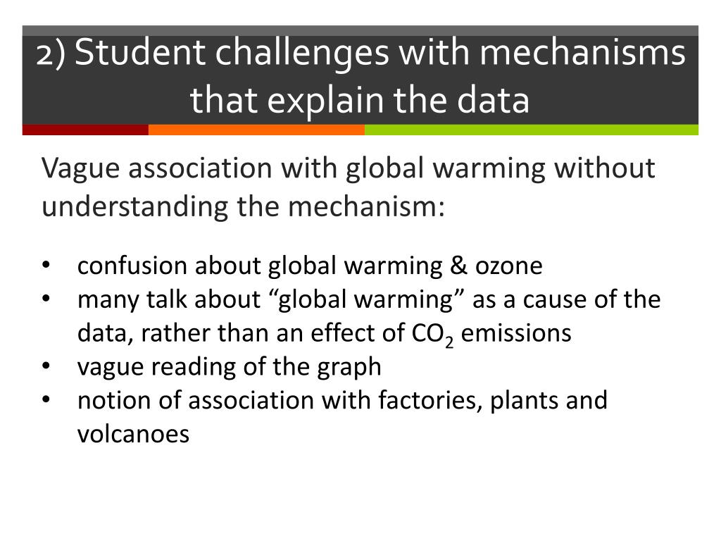 2) Student challenges with mechanisms that explain the data Vague association with global warming without understanding the mechanism: • confusion about global warming & ozone • many talk about “global warming” as a cause of the data, rather than an effect of CO2emissions • vague reading of the graph • notion of association with factories, plants and volcanoes