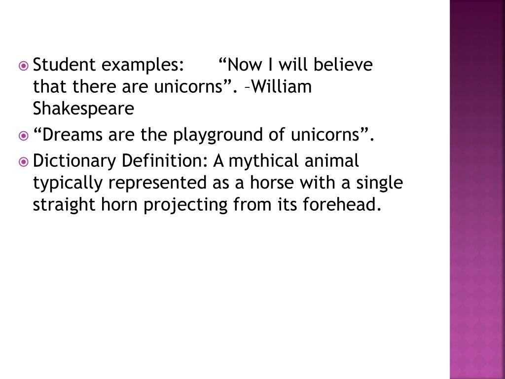 Student examples: “Now I will believe that there are unicorns”. –William Shakespeare • “Dreams are the playground of unicorns”. • Dictionary Definition: A mythical animal typically represented as a horse with a single straight horn projecting from its forehead.