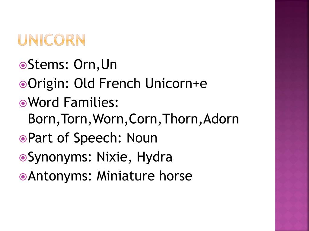 Unicorn • Stems: Orn,Un • Origin: Old French Unicorn+e • Word Families: Born,Torn,Worn,Corn,Thorn,Adorn • Part of Speech: Noun • Synonyms: Nixie, Hydra • Antonyms: Miniature horse