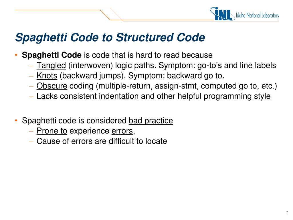 Spaghetti Code to Structured Code • Spaghetti Code is code that is hard to read because • Tangled (interwoven) logic paths. Symptom: go-to’s and line labels • Knots (backward jumps). Symptom: backward go to. • Obscure coding (multiple-return, assign-stmt, computed go to, etc.) • Lacks consistent indentation and other helpful programming style • Spaghetti code is considered bad practice • Prone to experience errors, • Cause of errors are difficult to locate