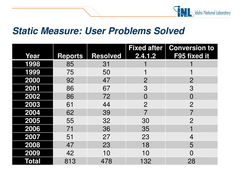 Static Measure (Spaghetti) – McCabe Index • McCabe Cyclomatic index = industry-standard, code-complexity measure. • Number of independent linear paths through code • Indicates the number of branches within it. • Higher indices => more branches => harder to maintain. • Cyclomatic index of 100 or less is generally considered low complexity and good programming • Only input processing subroutines have 100+ index
