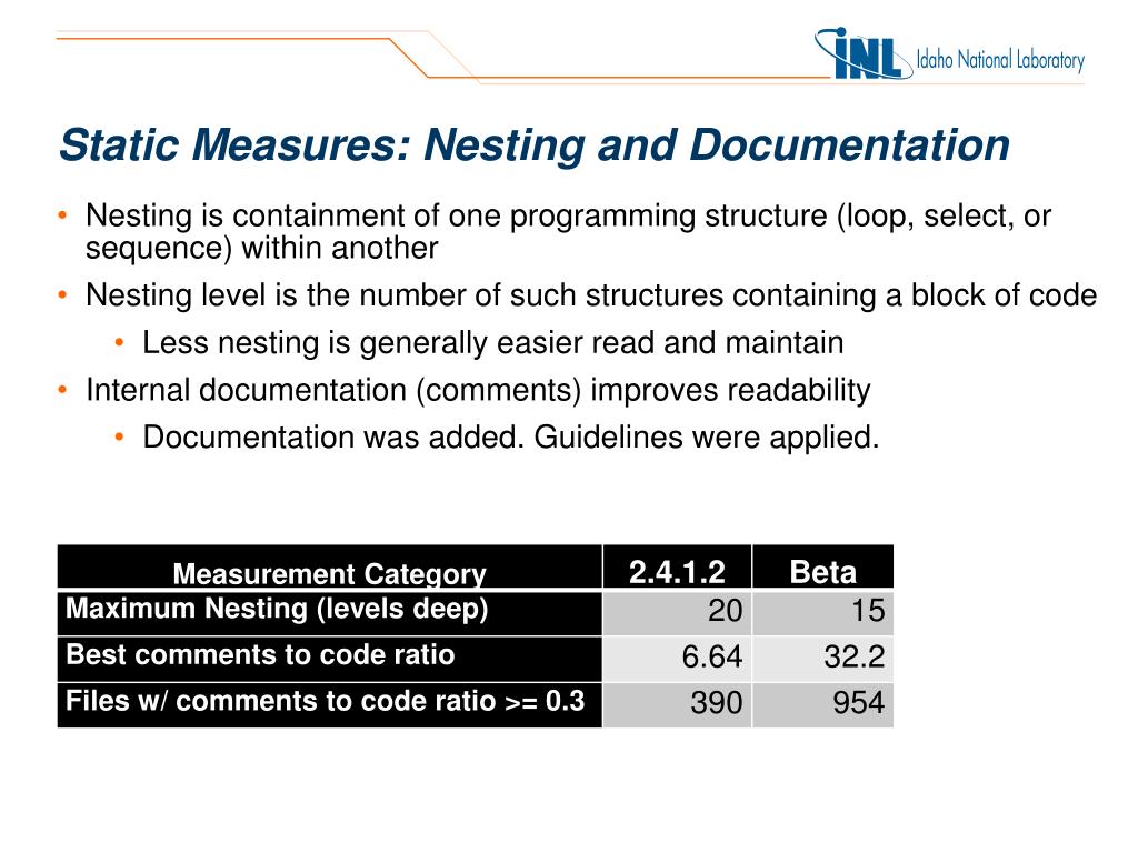 Static Measures: Nesting and Documentation • Nesting is containment of one programming structure (loop, select, or sequence) within another • Nesting level is the number of such structures containing a block of code • Less nesting is generally easier read and maintain • Internal documentation (comments) improves readability • Documentation was added. Guidelines were applied.