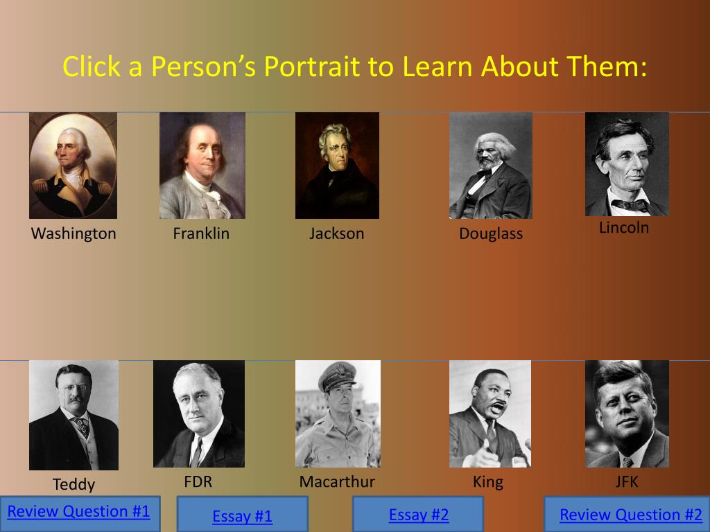 Click a Person’s Portrait to Learn About Them: Lincoln Washington Franklin Jackson Douglass FDR Macarthur King JFK Teddy Review Question #1 Essay #2 Review Question #2 Essay #1