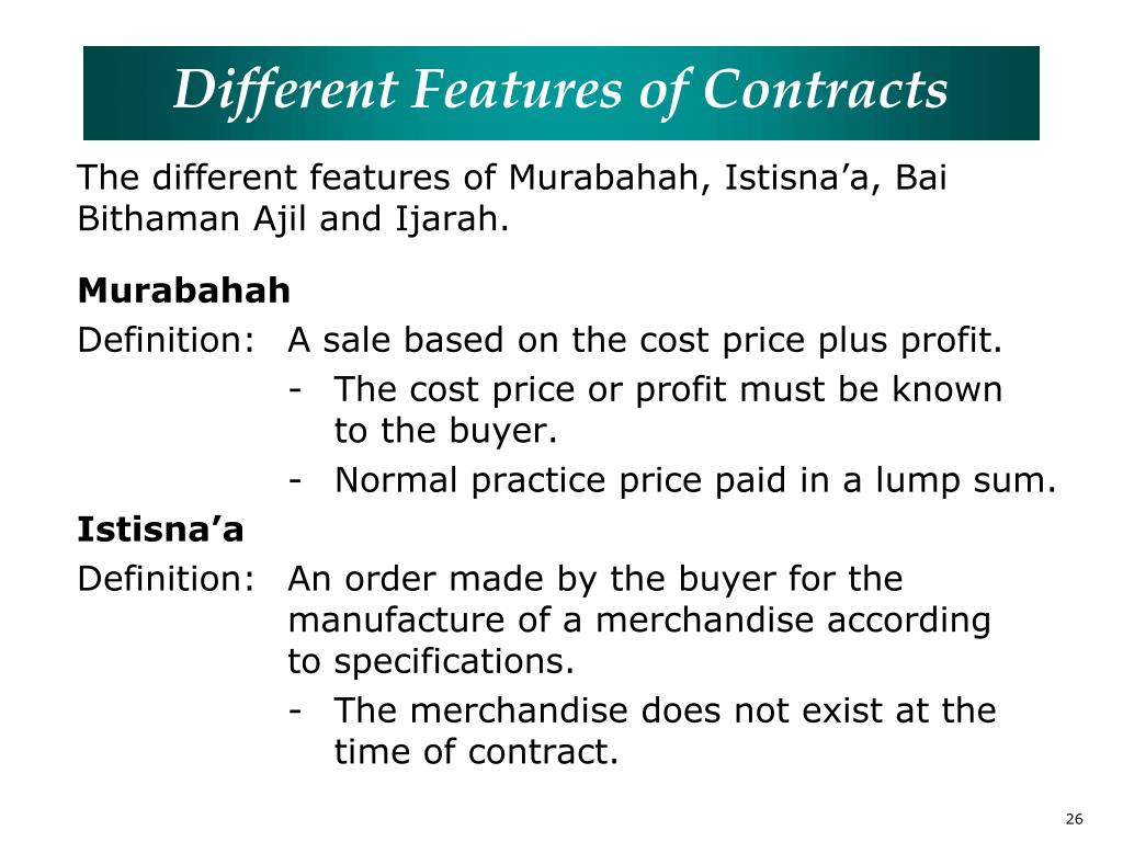 Different Features of Contracts The different features of Murabahah, Istisna’a, Bai Bithaman Ajil and Ijarah. Murabahah Definition: A sale based on the cost price plus profit. - The cost price or profit must be known to the buyer. - Normal practice price paid in a lump sum. Istisna’a Definition: An order made by the buyer for the manufacture of a merchandise according to specifications. - The merchandise does not exist at the time of contract.