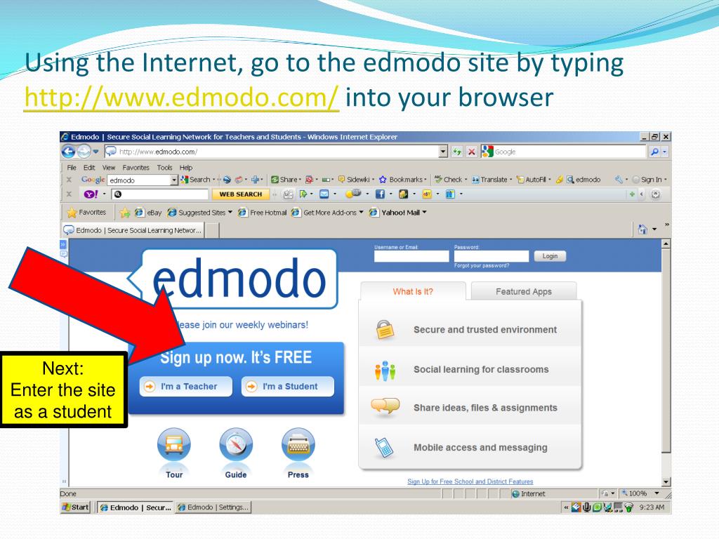 Using the Internet, go to the edmodo site by typing http://www.edmodo.com/ into your browser Next: Enter the site as a student