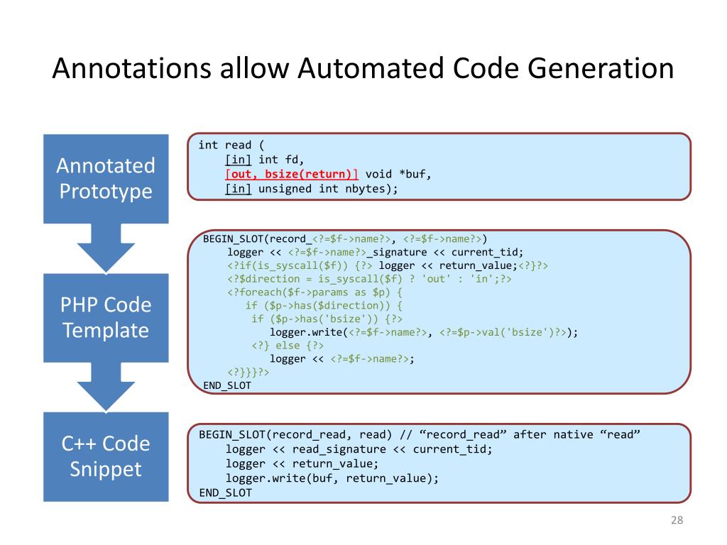 Annotations allow Automated Code Generation int read ( [in]intfd, [out, bsize(return)] void *buf, [in] unsigned intnbytes); BEGIN_SLOT(record_<?=$f->name?>, <?=$f->name?>) logger << <?=$f->name?>_signature << current_tid; <?if(is_syscall($f)) {?> logger << return_value;<?}?> <?$direction = is_syscall($f) ? 'out' : 'in';?> <?foreach($f->params as $p) { if ($p->has($direction)) { if ($p->has('bsize')) {?> logger.write(<?=$f->name?>, <?=$p->val('bsize')?>); <?} else {?> logger << <?=$f->name?>; <?}}}?> END_SLOT BEGIN_SLOT(record_read, read) // “record_read” after native “read” logger << read_signature << current_tid; logger << return_value; logger.write(buf, return_value); END_SLOT