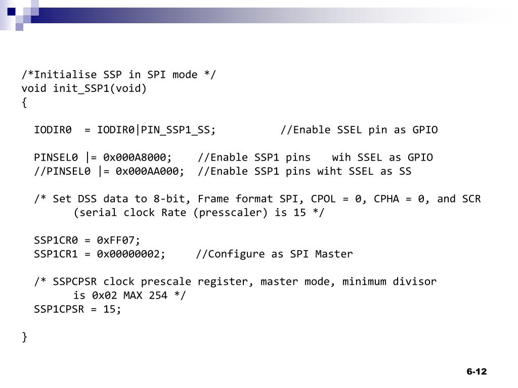 /*Initialise SSP in SPI mode */ void init_SSP1(void) { IODIR0 = IODIR0|PIN_SSP1_SS; //Enable SSEL pin as GPIO PINSEL0 |= 0x000A8000; //Enable SSP1 pins wih SSEL as GPIO //PINSEL0 |= 0x000AA000; //Enable SSP1 pins wiht SSEL as SS /* Set DSS data to 8-bit, Frame format SPI, CPOL = 0, CPHA = 0, and SCR (serial clock Rate (presscaler) is 15 */ SSP1CR0 = 0xFF07; SSP1CR1 = 0x00000002; //Configure as SPI Master /* SSPCPSR clock prescale register, master mode, minimum divisor is 0x02 MAX 254 */ SSP1CPSR = 15; }