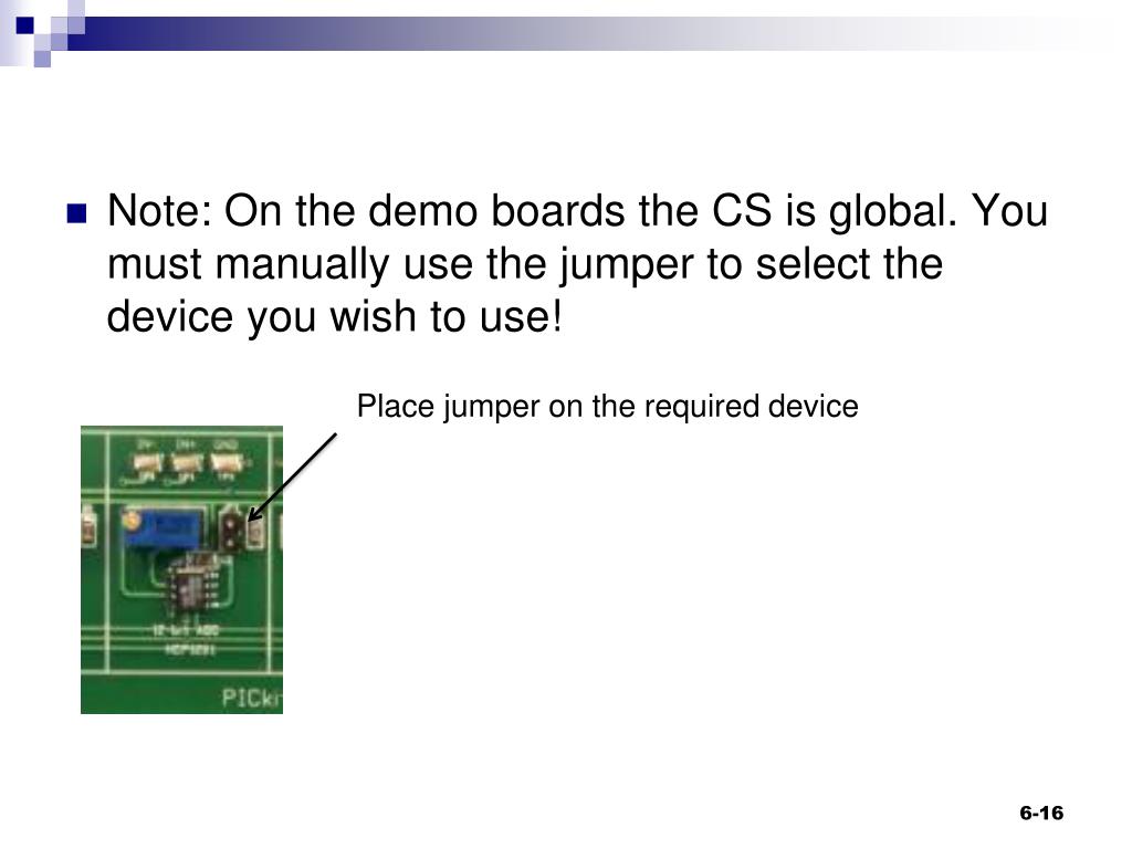 Place jumper on the required device Note: On the demo boards the CS is global. You must manually use the jumper to select the device you wish to use!