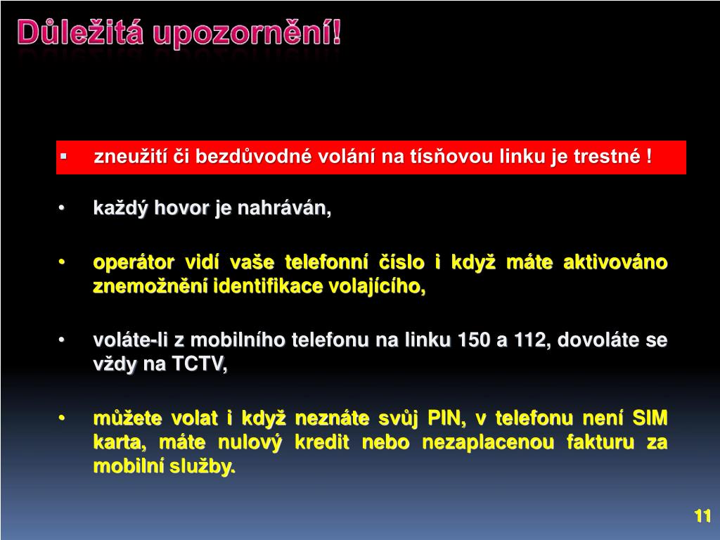 zneužití či bezdůvodné volání na tísňovou linku je trestné ! • každý hovor je nahráván, • operátor vidí vaše telefonní číslo i když máte aktivováno znemožnění identifikace volajícího, • voláte-li z mobilního telefonu na linku 150 a 112, dovoláte se vždy na TCTV, • můžete volat i když neznáte svůj PIN, v telefonu není SIM karta, máte nulový kredit nebo nezaplacenou fakturu za mobilní služby. 11