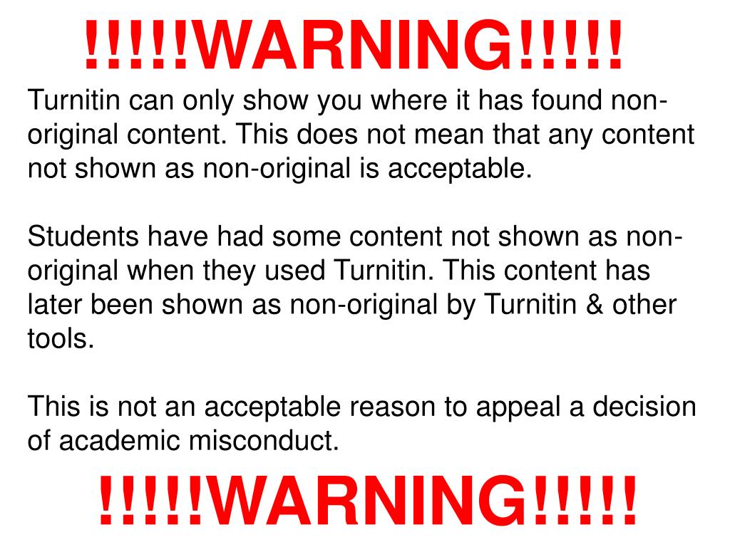 !!!!!WARNING!!!!! Turnitin can only show you where it has found non-original content. This does not mean that any content not shown as non-original is acceptable. Students have had some content not shown as non-original when they used Turnitin. This content has later been shown as non-original by Turnitin & other tools. This is not an acceptable reason to appeal a decision of academic misconduct. !!!!!WARNING!!!!!