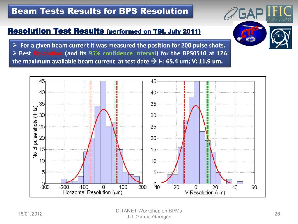 Beam Tests Results for BPS Resolution Resolution Test Results (performed on TBL July 2011) • For a given beam current it was measured the position for 200 pulse shots. • Best Resolution (and its 95% confidence interval) for the BPS0510 at 12A the maximum available beam current at test date H: 65.4 um; V: 11.9 um. DITANET Workshop on BPMs J.J. García-Garrigós