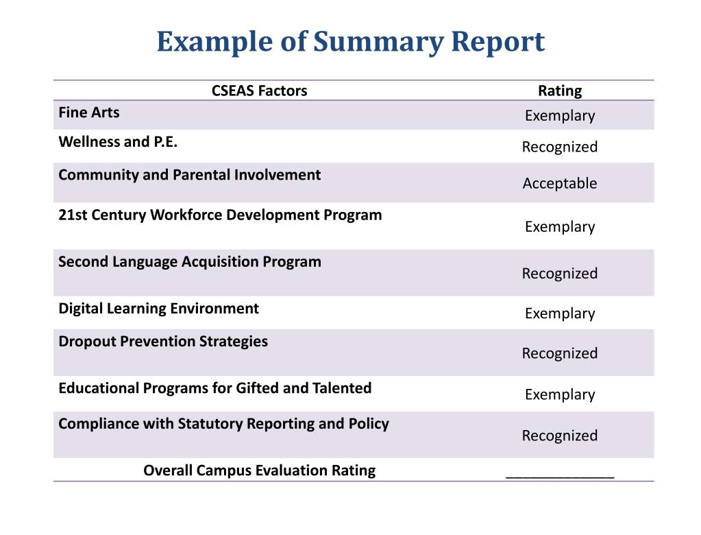 HB 5 – Sec. 39.0545 Each school district shall evaluate the district's performance and the performance of each campus and assign the district and each campus a performance rating of exemplary, recognized, acceptable, or unacceptable for both overall performance and each individual evaluation factor. Nine Factors: • Fine Arts • Wellness and P.E. • Community and Parental Involvement • 21st Century Workforce Development Program • Second Language Acquisition Program • Digital Learning Environment • Dropout Prevention Strategies • Educational Programs for Gifted and Talented Students • Record of District and Campus Compliance with Statutory Reporting and Policy Requirements