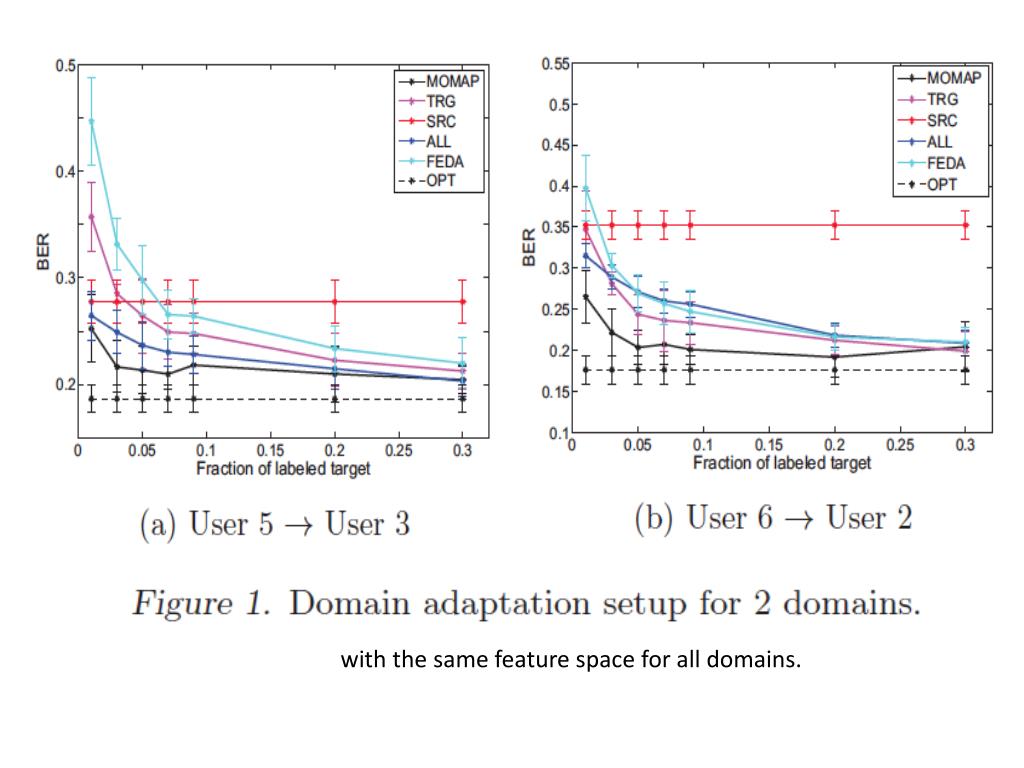 Experiments • Activity recognition task with the following human activities: walking, running, going upstairs, going downstairs, lingering. • Data recorded by different users are regarded as different outlooks (domains), since the sensors used are different. • Two setups are examined: domain adaptation with shared feature space, and multiple outlooks with different feature spaces. • The authors tested the success of the mapping algorithm by classification of the target test data with a SVM classifier trained on the mapped source data.