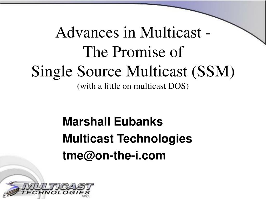 Advances in Multicast - The Promise of Single Source Multicast (SSM)(with a little on multicast DOS) Marshall Eubanks Multicast Technologies tme@on-the-i.com