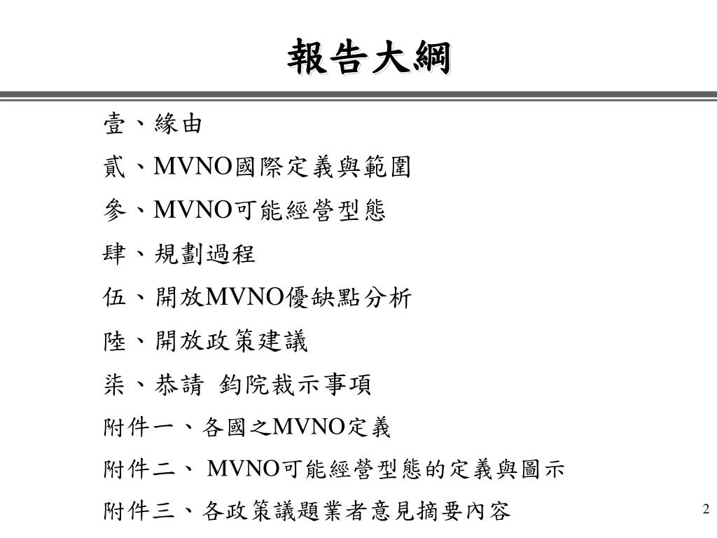 報告大綱 壹、緣由 貳、MVNO國際定義與範圍 參、MVNO可能經營型態 肆、規劃過程 伍、開放MVNO優缺點分析 陸、開放政策建議 柒、恭請 鈞院裁示事項 附件一、各國之MVNO定義 附件二、 MVNO可能經營型態的定義與圖示 附件三、各政策議題業者意見摘要內容