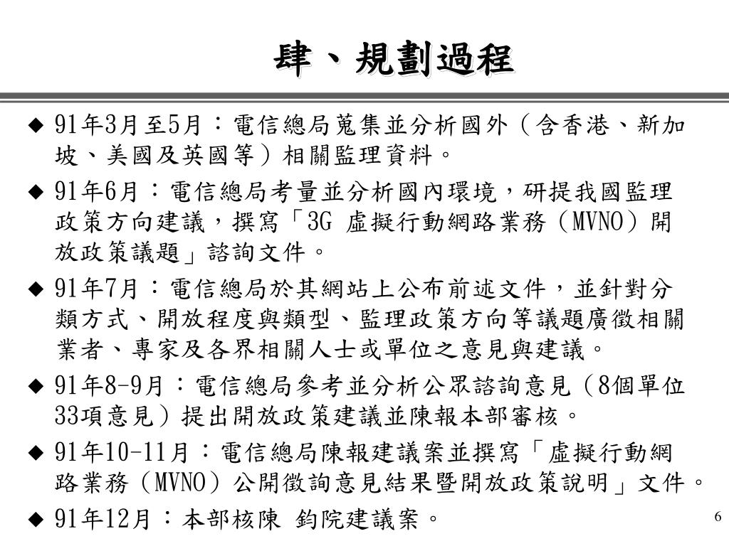 肆、規劃過程 • 91年3月至5月:電信總局蒐集並分析國外(含香港、新加坡、美國及英國等)相關監理資料。 • 91年6月:電信總局考量並分析國內環境,研提我國監理政策方向建議,撰寫「3G 虛擬行動網路業務(MVNO)開放政策議題」諮詢文件。 • 91年7月:電信總局於其網站上公布前述文件,並針對分類方式、開放程度與類型、監理政策方向等議題廣徵相關業者、專家及各界相關人士或單位之意見與建議。 • 91年8-9月:電信總局參考並分析公眾諮詢意見(8個單位33項意見)提出開放政策建議並陳報本部審核。 • 91年10-11月:電信總局陳報建議案並撰寫「虛擬行動網路業務(MVNO)公開徵詢意見結果暨開放政策說明」文件。 • 91年12月:本部核陳 鈞院建議案。