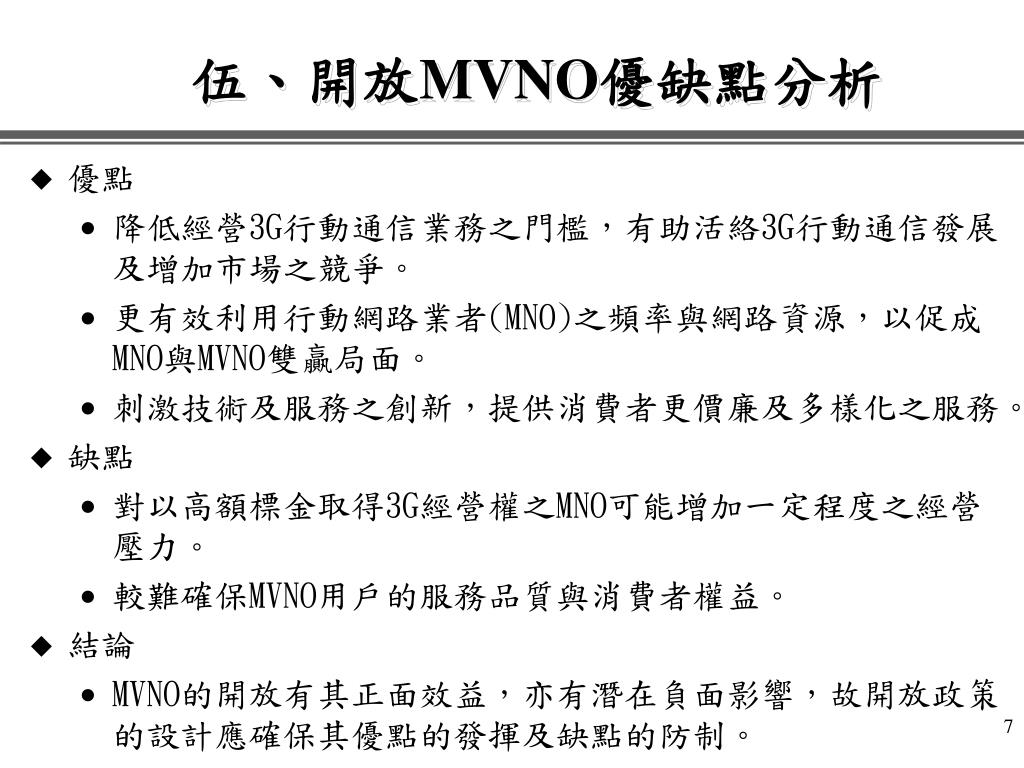 伍、開放MVNO優缺點分析 • 優點 • 降低經營3G行動通信業務之門檻,有助活絡3G行動通信發展及增加市場之競爭。 • 更有效利用行動網路業者(MNO)之頻率與網路資源,以促成MNO與MVNO雙贏局面。 • 刺激技術及服務之創新,提供消費者更價廉及多樣化之服務。 • 缺點 • 對以高額標金取得3G經營權之MNO可能增加一定程度之經營壓力。 • 較難確保MVNO用戶的服務品質與消費者權益。 • 結論 • MVNO的開放有其正面效益,亦有潛在負面影響,故開放政策的設計應確保其優點的發揮及缺點的防制。