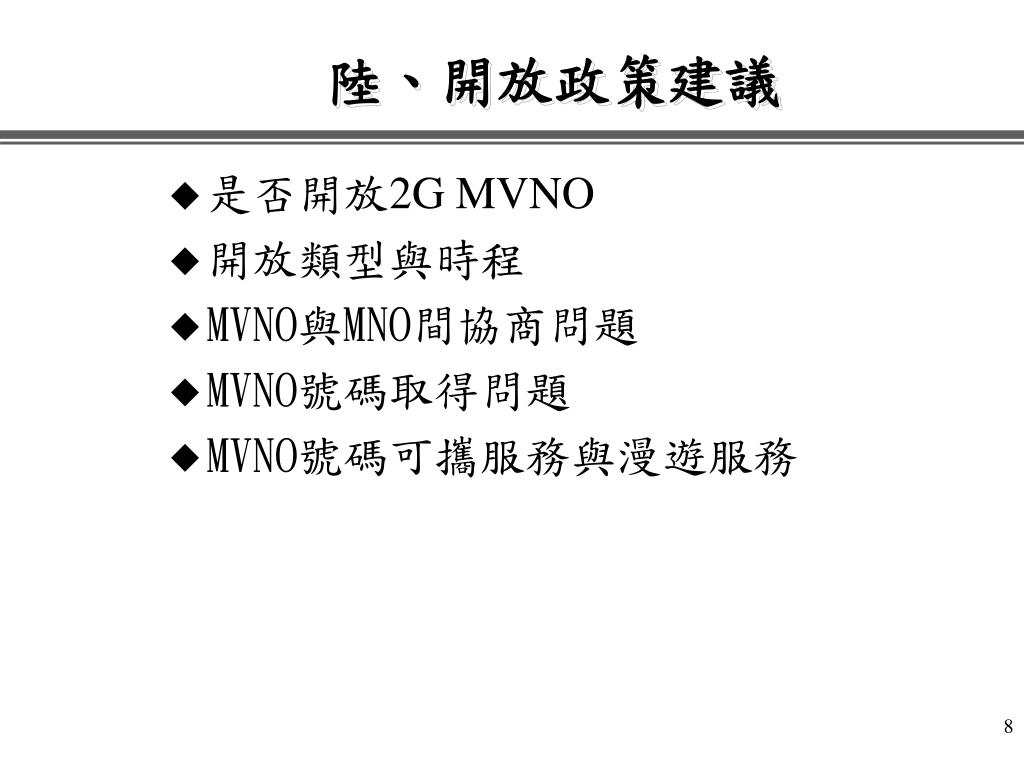 陸、開放政策建議 • 是否開放2G MVNO • 開放類型與時程 • MVNO與MNO間協商問題 • MVNO號碼取得問題 • MVNO號碼可攜服務與漫遊服務