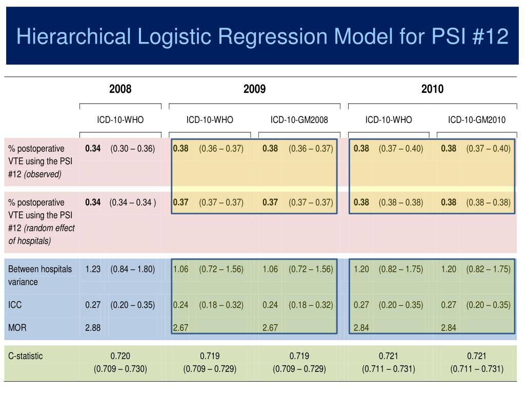 PSI 12 estimates using Swiss / French Data • Routine Data (ICD10) from overall Swiss / French hospitals (3 consecutives years) • Hierarchical Two-Level Logistic Regression Model for estimating PSI #12 outcomes • Level-1 = Inpatients • Level-2 = Hospitals