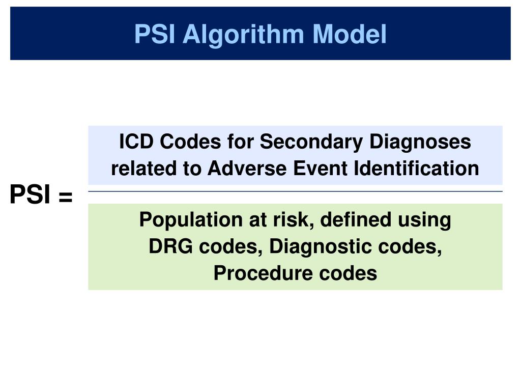 PSI Algorithm Model ICD Codes for Secondary Diagnoses related to Adverse Event Identification PSI = Population at risk, defined usingDRG codes, Diagnostic codes, Procedure codes